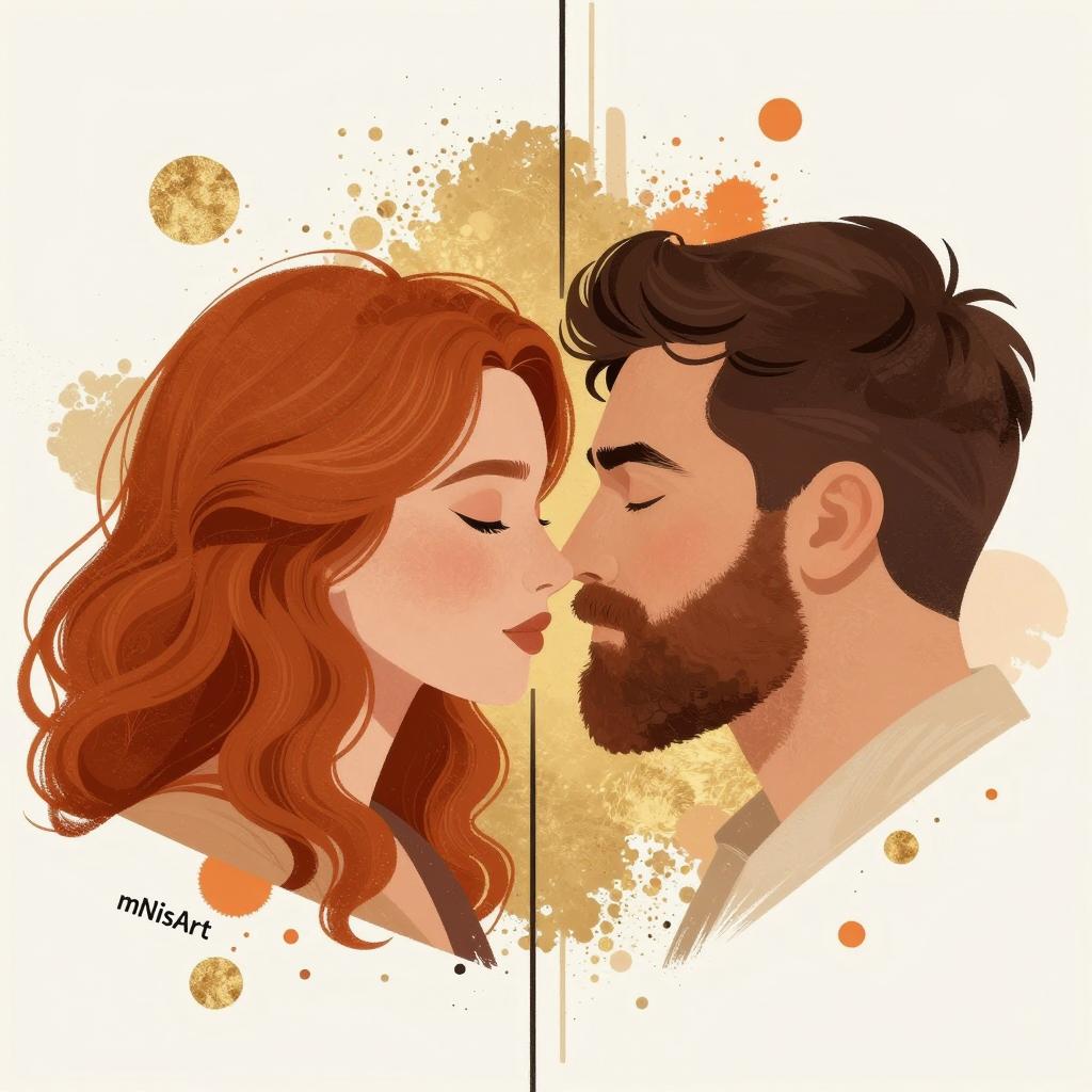 Illustration of a red-haired woman and a bearded man with closed eyes, noses touching, on a ured background with gold and orange splatters. Vertical black lines separate them. Man's dark hair contrasts with woman's curly hair. Both have fair skin. Artist's "mNisArt" in bottom left.