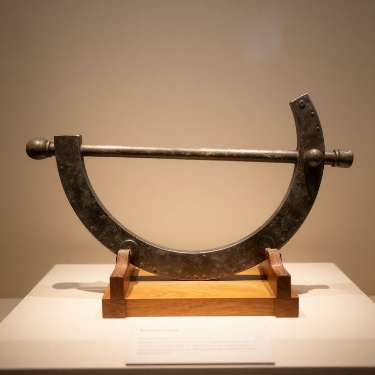 Photograph of an ancient, metal, U-shaped bow drill with a horizontally aligned wooden rod, displayed on a wooden stand against a plain, beige background. The bow drill's metal arms are curved and show signs of rust and wear, with a textured, weathered surface. The wooden stand is simple and rectangular, providing support for the metal instrument. The lighting is soft, highlighting the drill's aged appearance and the wooden stand's smooth texture. The overall composition is minimalist, focusing solely on the historical tool.
