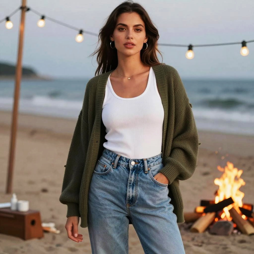 A woman in a casual chic style, wearing a white tank top and an oversized olive cardigan, paired with high-waisted light blue denim jeans. She stands under string lights at a beach bonfire, evoking a warm, inviting atmosphere reminiscent of Tuttle Publishing's visual style. Sexy. Pretty face and beutiful eyes
