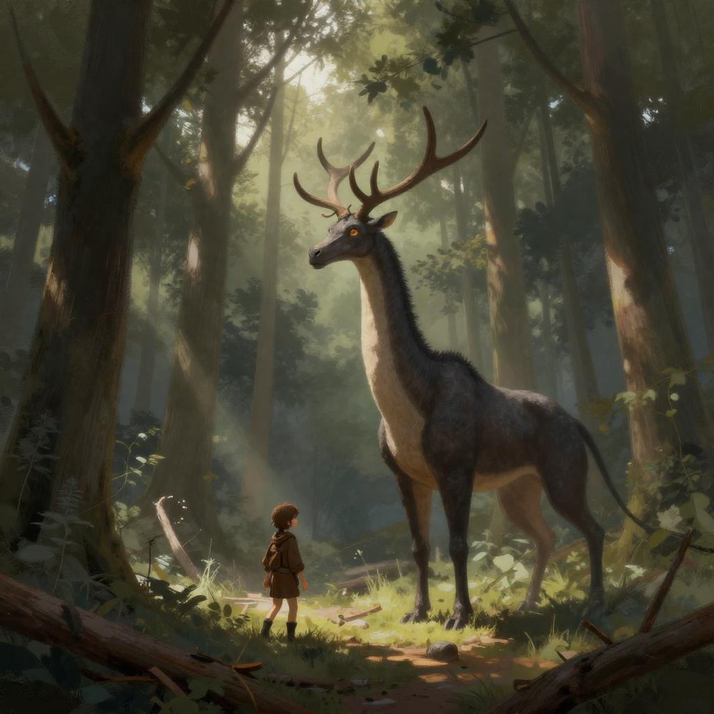 Digital painting of a forest with tall, thin trees. A large, mythical creature with a long neck and antlers stands in the right foreground, while a small, humanoid figure in brown clothing walks towards it from the left. Sunlight filters through the trees, casting long shadows. Fallen branches and a log lie on the forest floor.