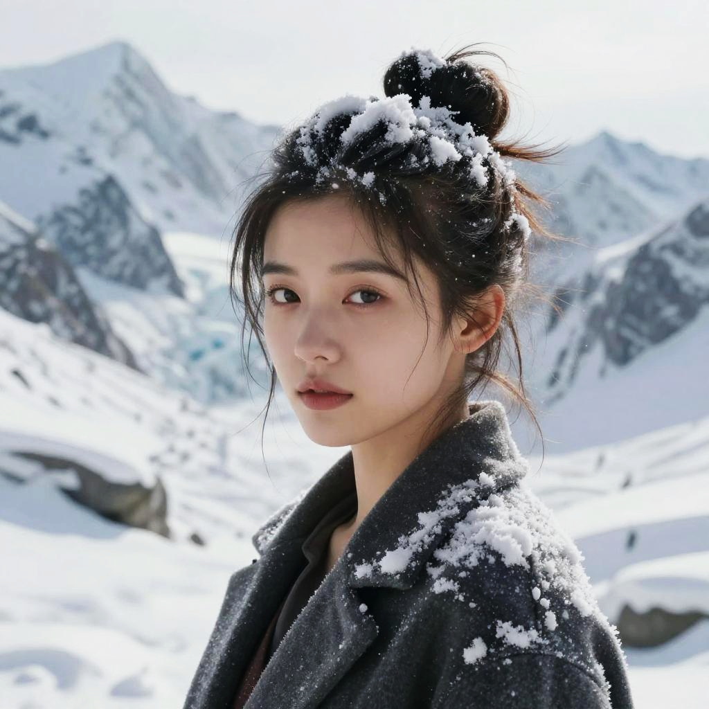 A woman poses on a beach with an artistic flair, wearing a cozy, knit hat and a warm sweater, her hair tousled by the seaside breeze.