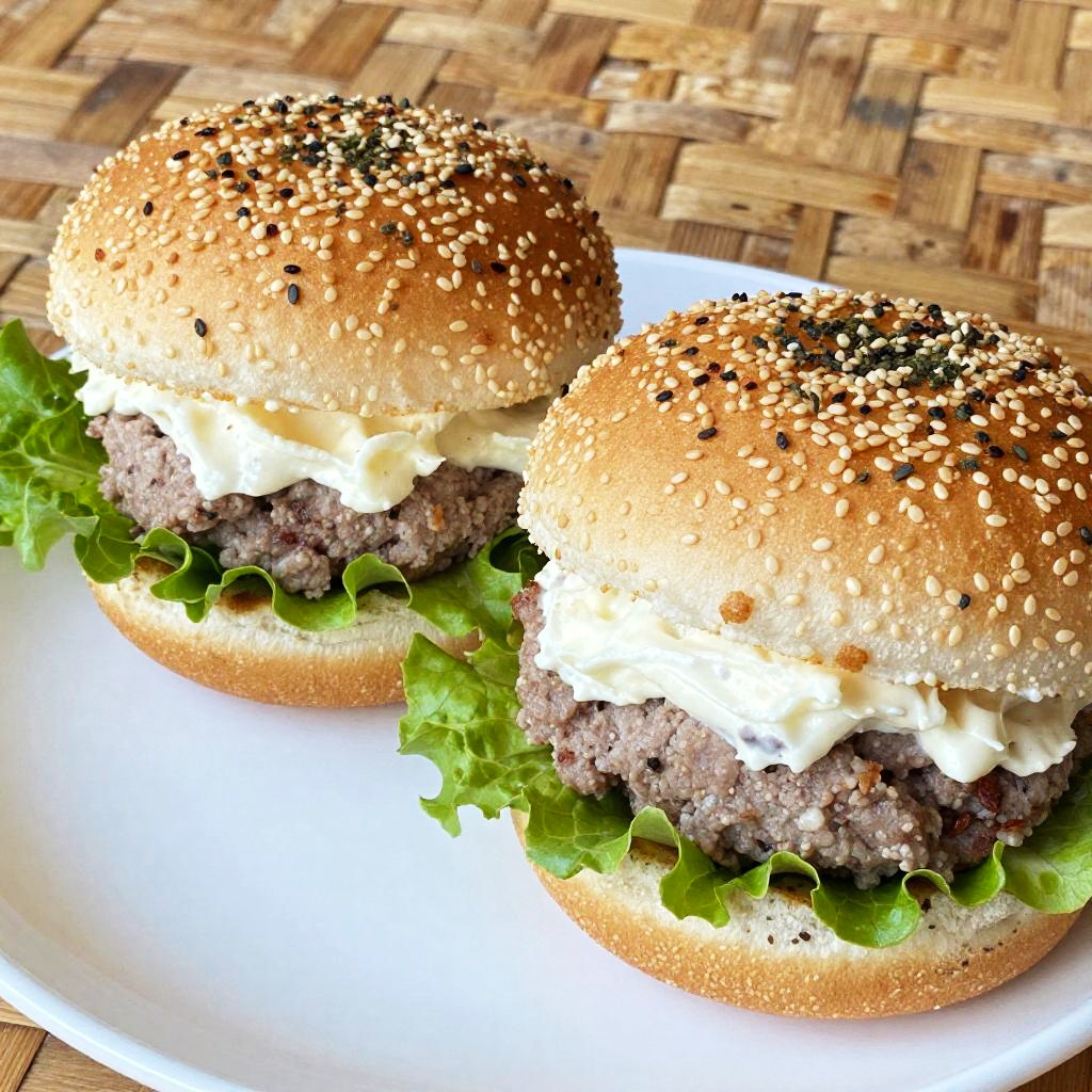 Close-up photo of two sesame seed and herb-covered burgers on a white plate with bright green lettuce. The burgers have a thick, creamy white filling topped with a layer of pinkish-brown meat. The background features a woven brown bamboo surface, adding a natural texture. The image is brightly lit, highlighting the fresh ingredients and crunchy sesame seeds.