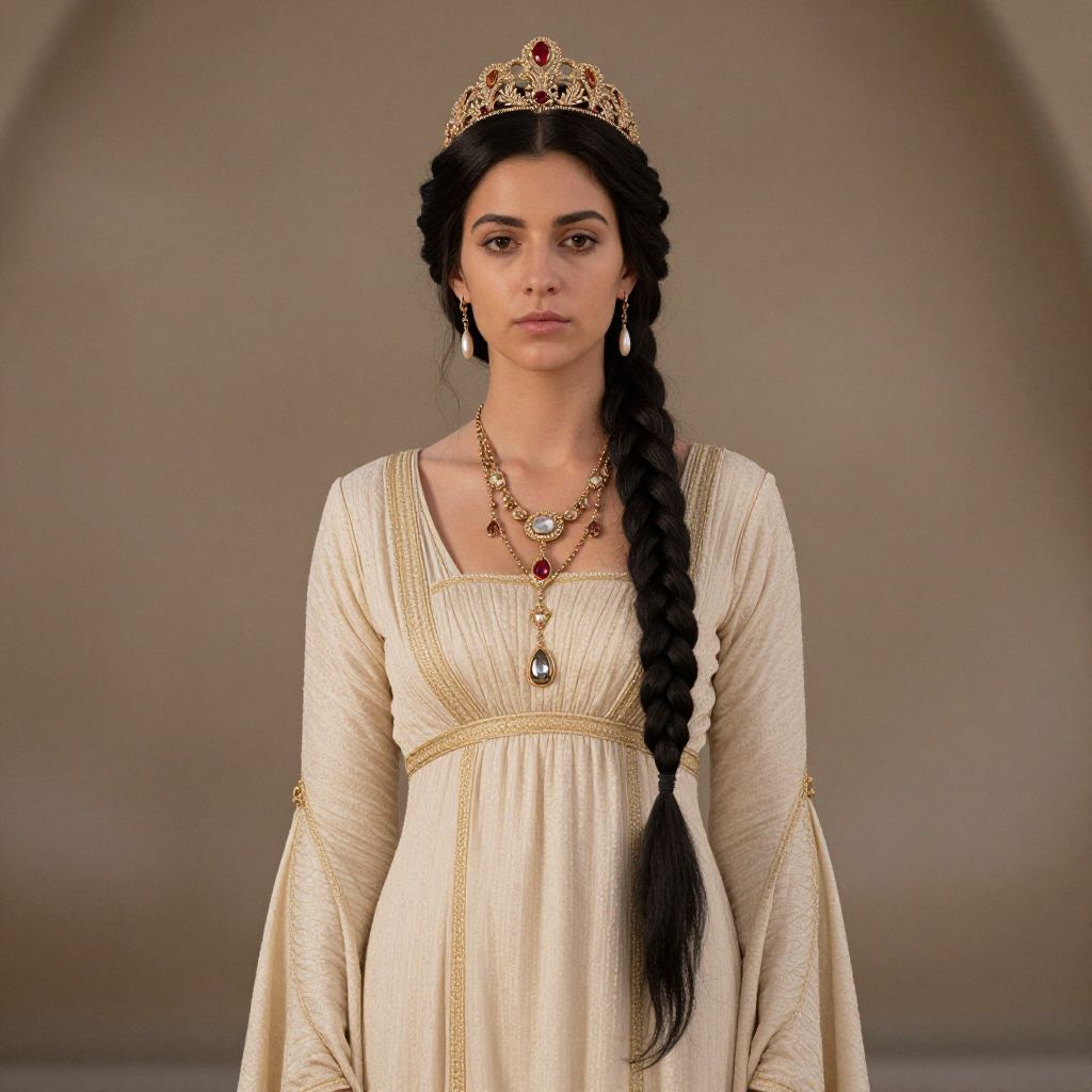 Empress theodora costume, 1girl, solo, jewelry, braid, necklace, crown, long hair, dress, looking at viewer, realistic, standing, earrings, closed mouth, black hair, long sleeves, single braid