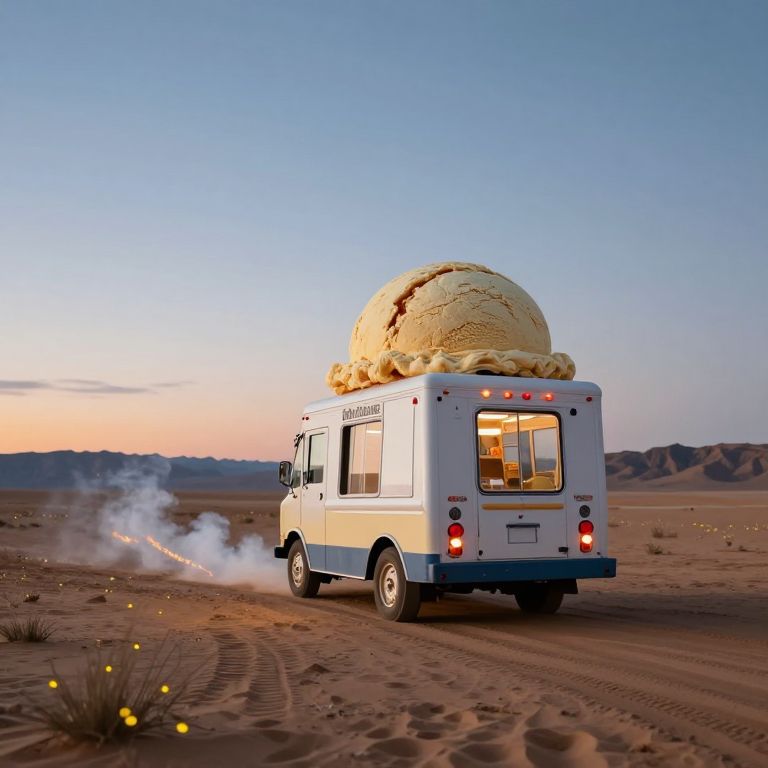 A lone ice cream truck, built from a single colossal scoop, drives backwards through a desert of frozen fireflies, leaving trails of melodic smoke.