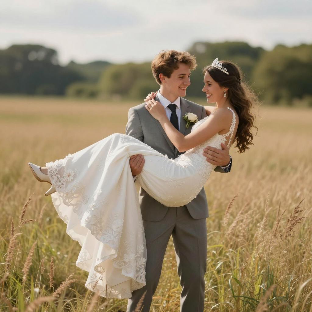 A photograph of a young couple in a sunlit field of tall, golden grass. The groom, with short brown hair, wears a gray suit and lifts the bride, who has wavy brown hair and wears a white, floral-embellished wedding dress and a silver tiara. She's smiling and holding a small object. The background shows a blurred, green treeline under a cloudy sky.