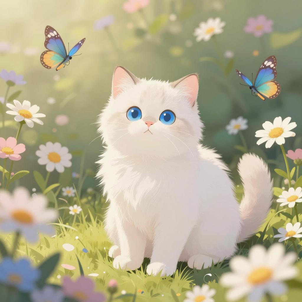 Illustration of a fluffy white kitten with blue eyes sitting in a vibrant flower garden filled with pastel daisies and butterflies. Soft sunlight brightens the whimsical and gentle ambiance.