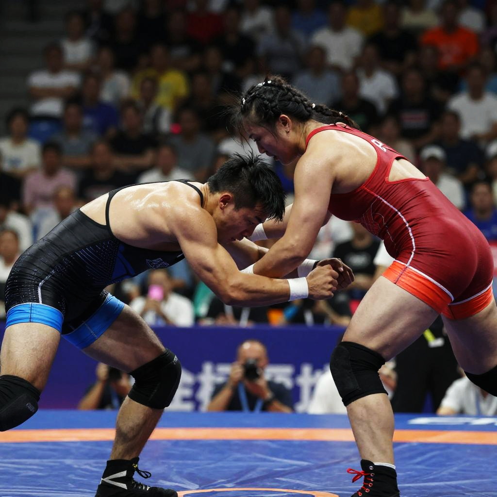 Male vs female wrestling fierce competition, vibrant crowd, action-packed scene, close-up on wrestlers' strength and technique, cinematic style, high contrast shadows