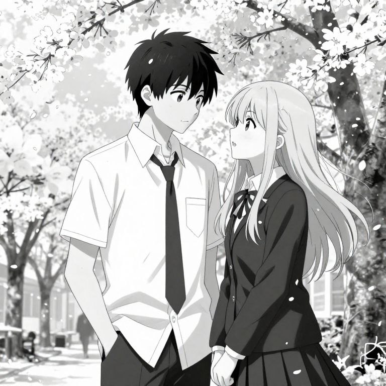 The image is a black-and-white manga-style illustration by Yusuke Murata, featuring a medium shot of two characters, a boy and a girl, wearing school uniforms and standing close to each other on a school campus. The boy, with dark hair, is wearing a white shirt and a black tie, while the girl, with long blonde hair, is dressed in a dark uniform with a white collar. They are both looking at each other, creating a sense of intimacy and connection. The background is filled with cherry blossom petals falling in the wind, adding a romantic and serene atmosphere to the scene. The overall composition is balanced, with the characters positioned centrally and the cherry blossoms framing the scene, enhancing the visual appeal and emotional depth of the illustration.