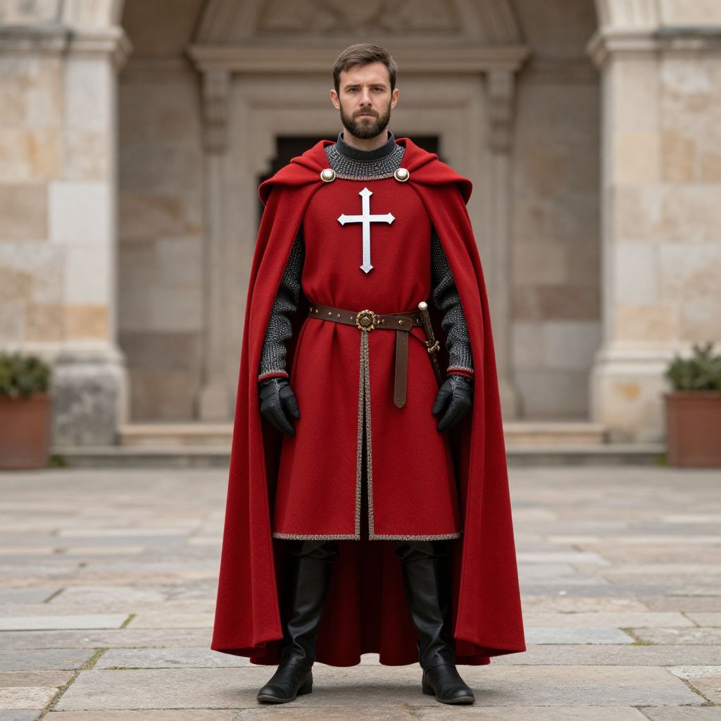 Knights templar outfit, 1boy, solo, male focus, facial hair, cape, standing, full body, beard, looking at viewer, cross, boots, red cape, gloves, belt