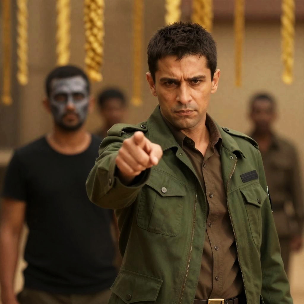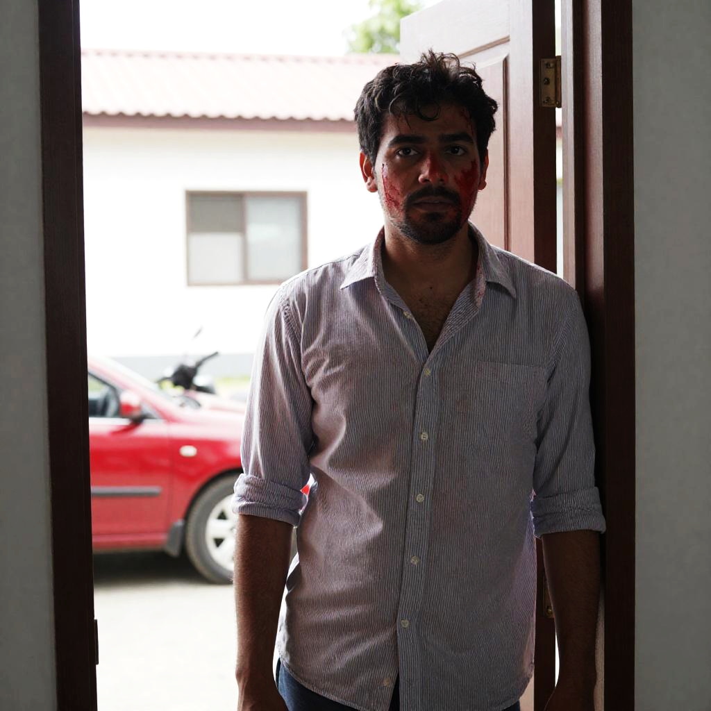 Photograph of two men. Foreground man, with dark hair and beard, in teal medical scrubs, runs with white towel in right hand, bandaged left hand. Background man, on fire, runs with intense expression. Urban setting, smoke, buildings, cars.
