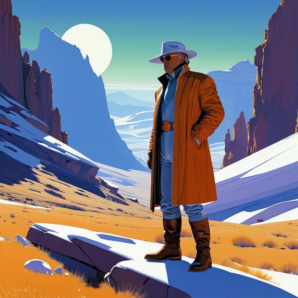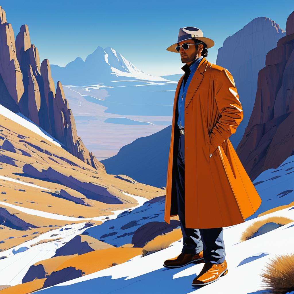 Enigmatic time traveler in the mountains, full body shot with detailed focus. Styled as digital illustration by Syd Mead, Moebius.