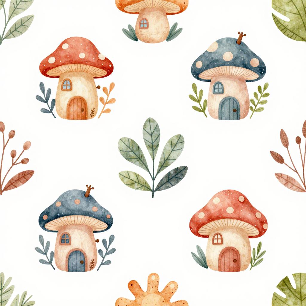 Seamless pattern of whimsical mushroom houses and various stylized leaves in pastel tones. The illustration features colorful mushroom-shaped homes with windows and doors, surrounded by delicate botanicals. Designed in a Scandinavian cartoon style with soft, vibrant colors and an endearing, playful atmosphere.