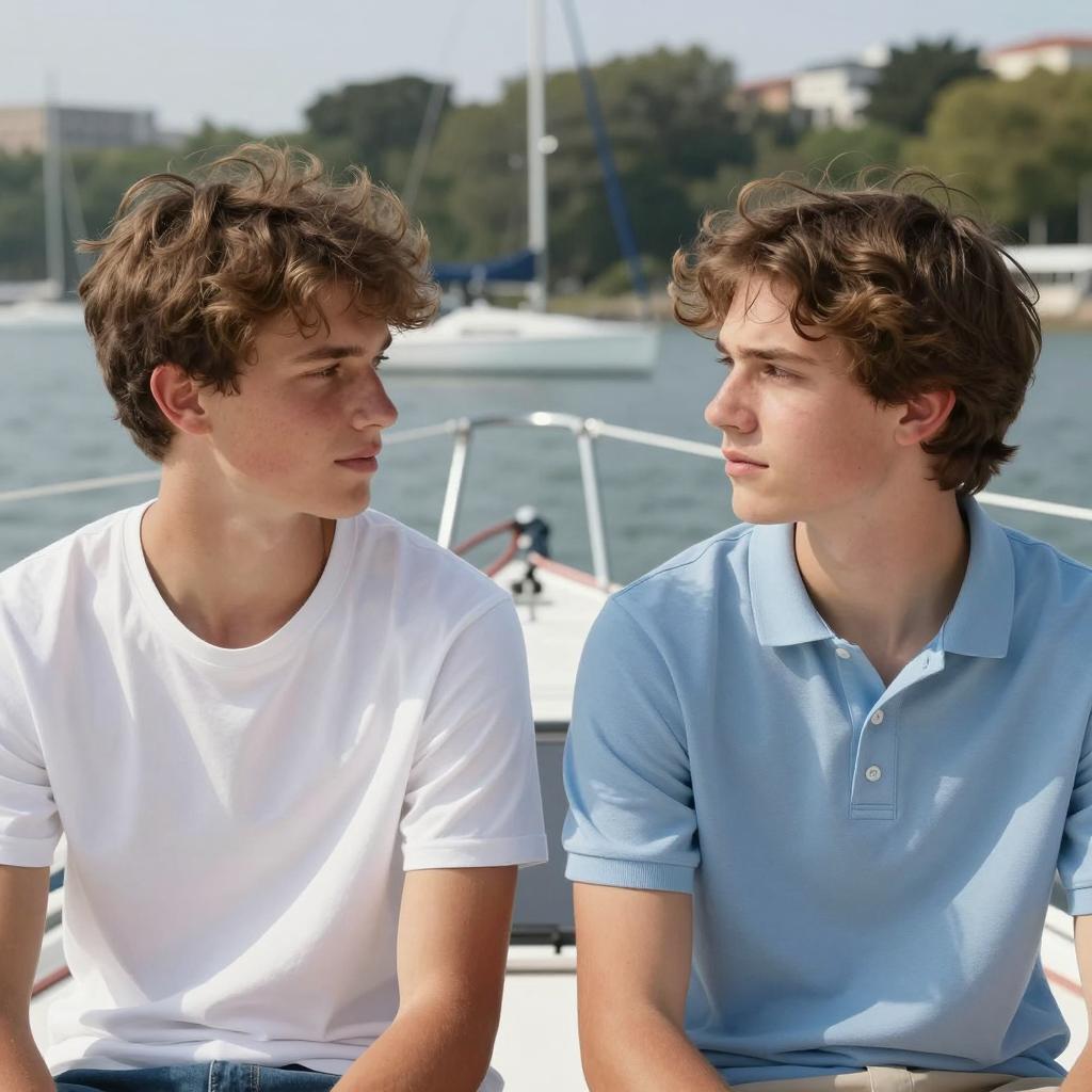 Photograph of two young men standing outside an old, stone building. The man on the left has curly blonde hair, wearing a brown sweater over a white shirt, with hands in pockets. The man on the right has dark curly hair, wearing a gray sweater, with arms crossed. Both have neutral expressions. The background includes a large window, overgrown plants, and autumn leaves. The man on the left stands slightly to the left, while the man on the right leans against the window frame.