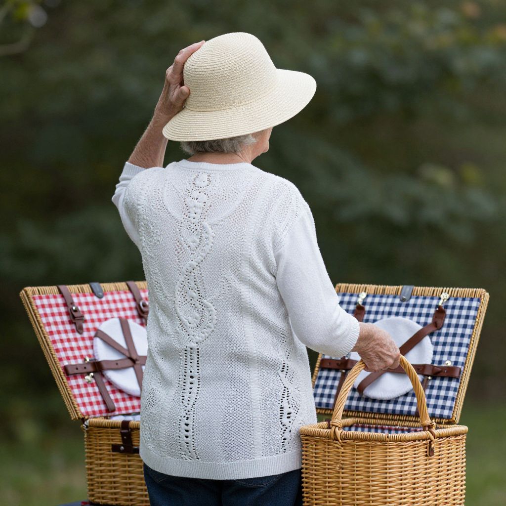 Photograph of a person standing outdoors, wearing a light blue, short-sleeved, slightly textured shirt and blue jeans. They hold a large, beige straw hat with a black band in their left hand, and a wicker picnic basket with red-and-white checkered lining and a brown leather strap in their right hand. The basket contains a white cloth napkin with a brown bow tie design. The background features a blurred green grassy area and tree trunks, suggesting a park or garden setting. The person's arms and torso are visible, but their face is not shown.