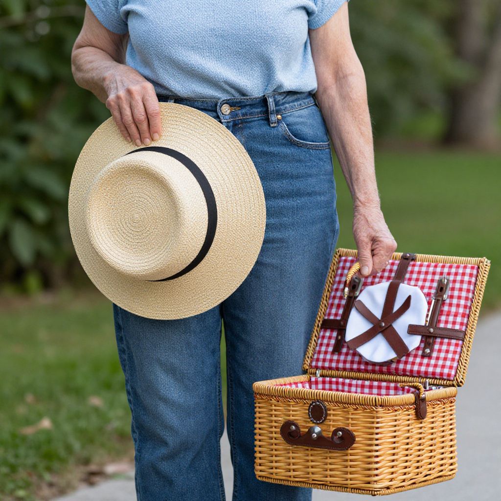 Photograph of a person in blue jeans and light blue shirt, holding a straw hat and wicker picnic basket with red checkered cloth and brown leather