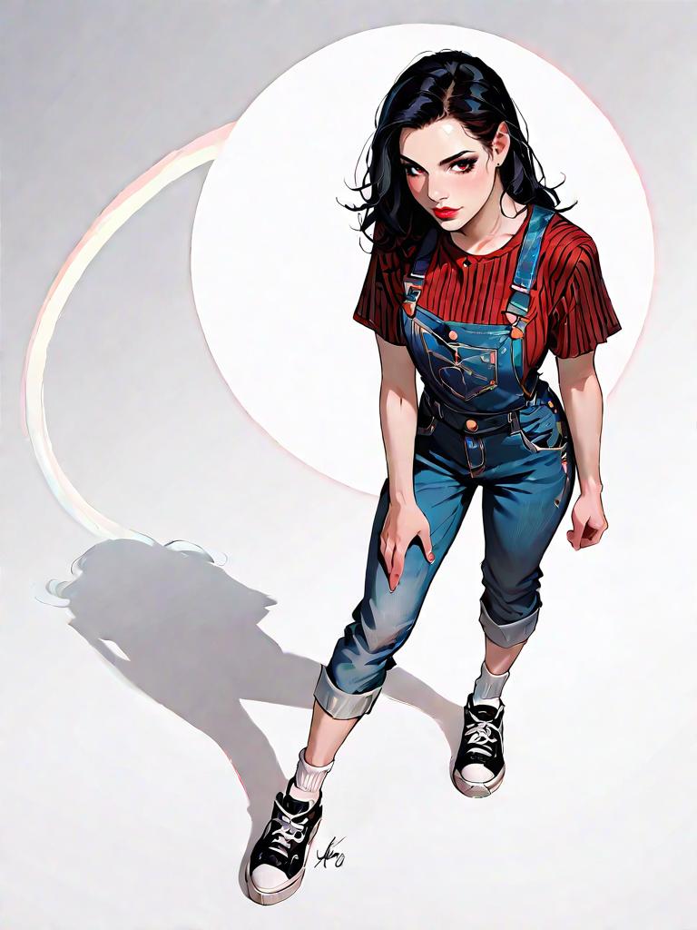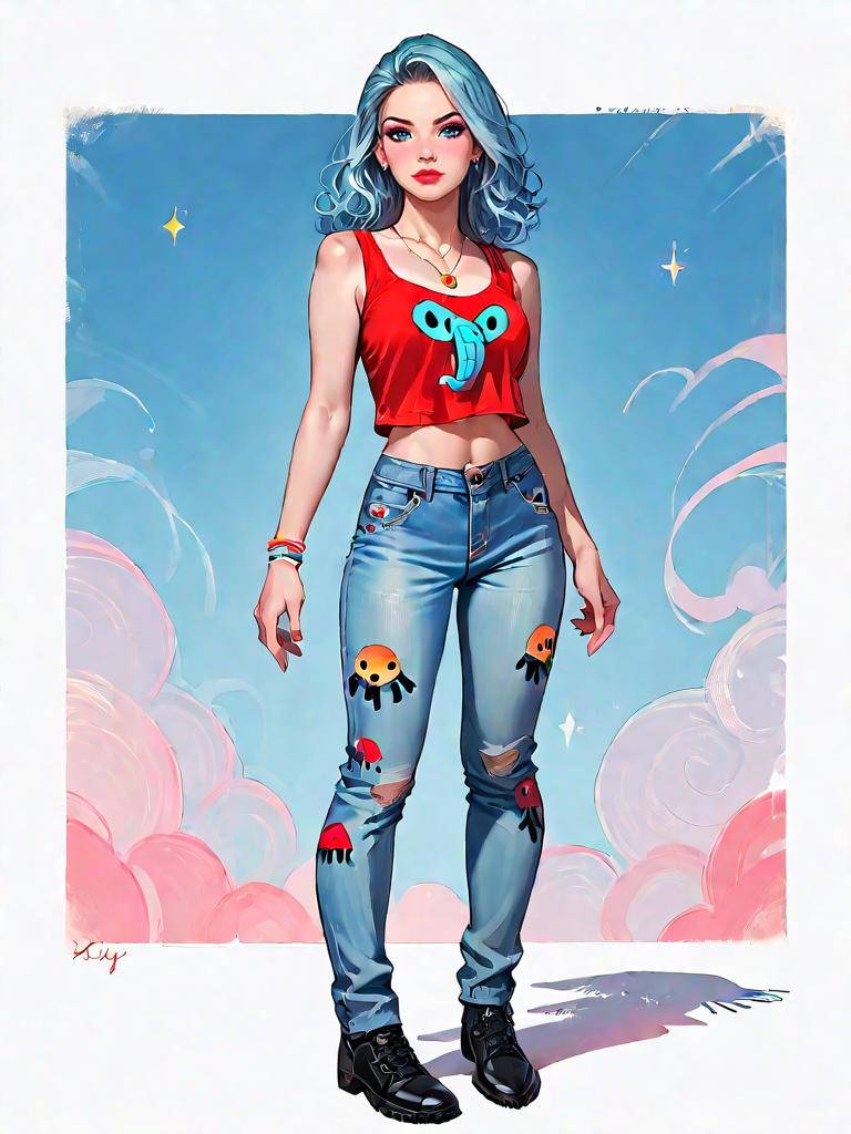1girl, source_comics, realistic face, full body shot, Woman, casual, red sleeveless top with a decorative elephant print and patterned border hem, scoop neckline, blue skinny jeans, multi-layered bracelets, pendant necklace.