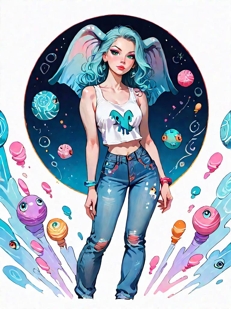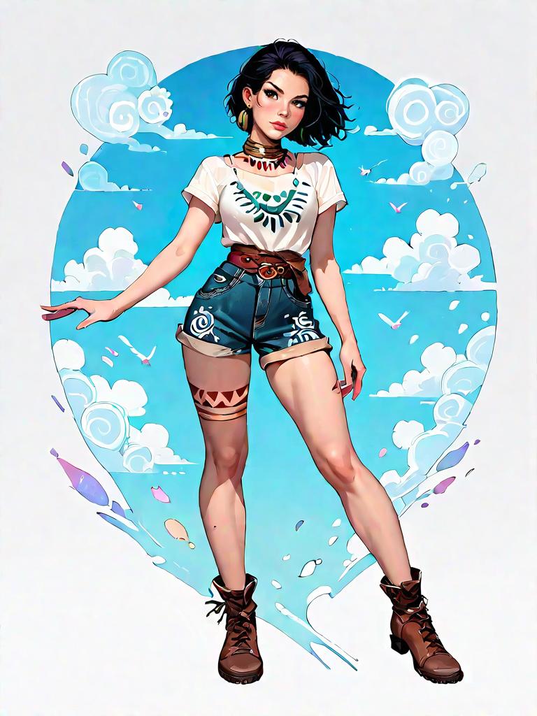 Digital artwork of a woman with dark hair in a casual outfit featuring a red sleeveless top with decorative elephant prints and blue skinny jeans with red and white patterns. She wears multi-layered bracelets and a pendant necklace. The background includes stylized elephants and a colorful circular sky element with clouds and rainbow stripes.