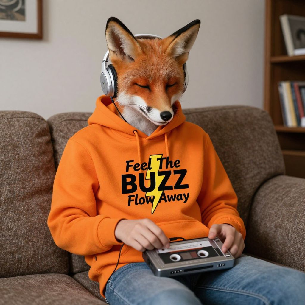 Portrait of an teenager anthro fox wearing an orange hoodie and lightweight headphones connected to a Walkman cassette tape player while sitting on a sofa in a rural livingroom, The fox has his eyes closed while concentrating and jamming to the music, The hoodie has a text \"Feel The BUZZ Flow Away\" laid over a lightning bolt symbol