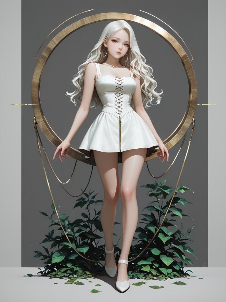 1girl, realistic face, full body shot, Woman, modern minimalist, white A-line mini dress, square neckline, thin straps, sleeveless, darted bodice, concealed back zipper, monochromatic palette, statement hoop earrings with leaf design, minimalist makeup, textured wavy hair, plain white studio background