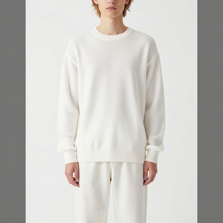 Photograph of a person standing against a plain white background with gray borders. They're wearing a long-sleeve, white, textured sweater and matching white pants. The person's face is partially visible, with short, light-colored hair and neutral expression. The sweater has a subtle knit pattern, and the pants are straight-legged. The overall look is casual and simple.