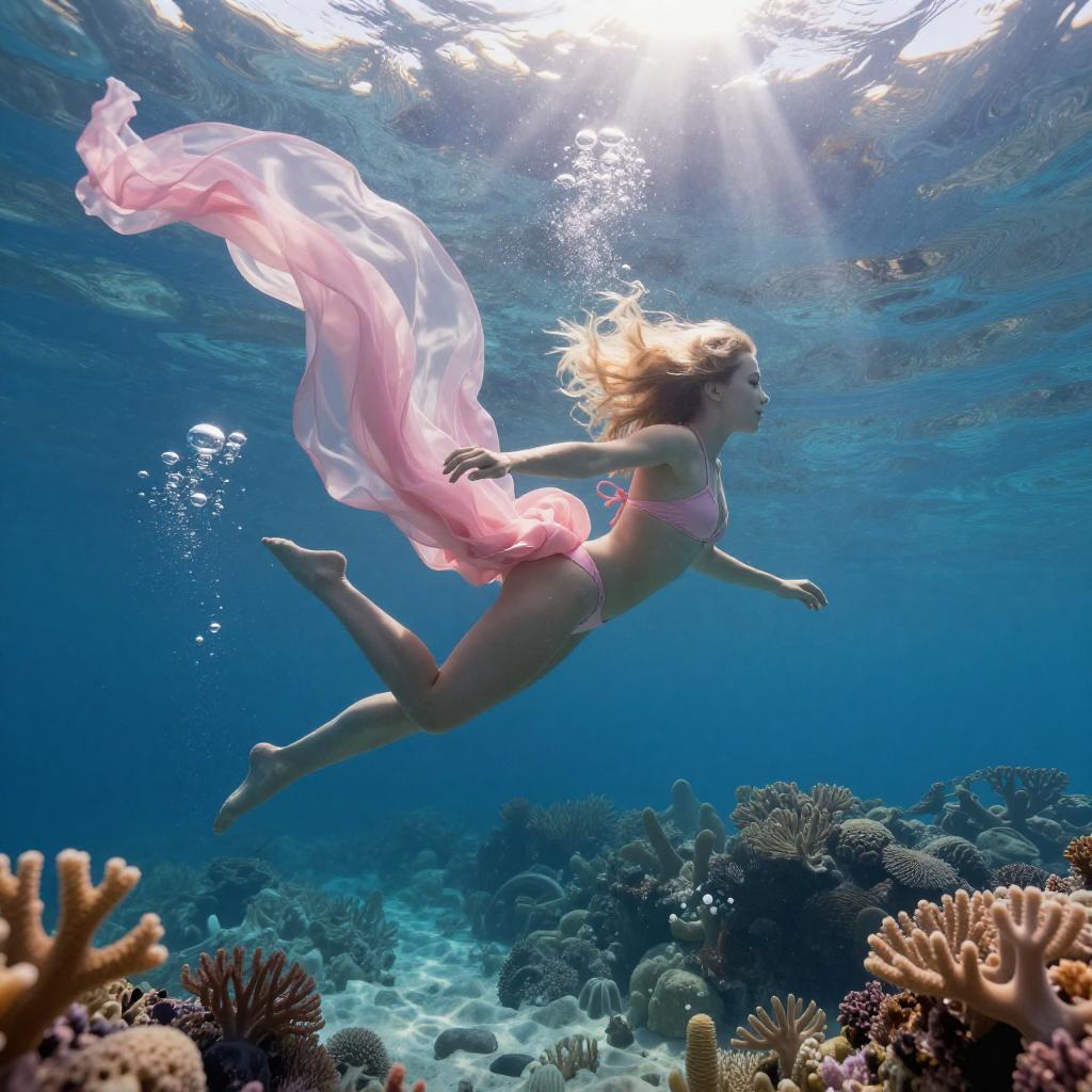 Digital artwork of a blonde woman swimming gracefully underwater near a vibrant coral reef. She is wearing a pink bikini with a flowing translucent fabric trailing behind her. Sunlight filters through the blue water, creating a radiant and dynamic atmosphere with bubbles rising upwards.