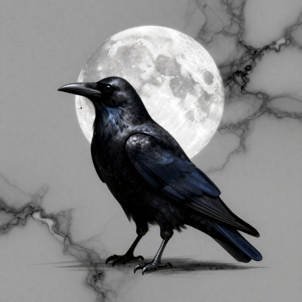 Raven and ink and moonlight, in the style of charcoal black and moonlight silver, graphic design-inspired illustrations, marble, sketchfab, depiction of animals, heistcore, dark gold and dark azure,