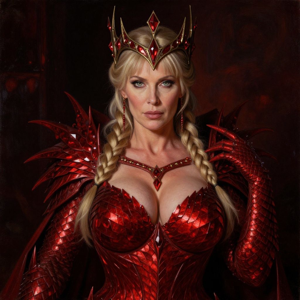 Photograph of mature woman (warrior queen), symmetrical crown, tiara, circlet, diadem, milf, Photorealistic oil painting of (beautiful:1.1) (bright eyes) (half-dragon warrior-queen:1.2) (Cloak 1:1) with (intricate metallic red brass scales seamlessly melded into arm and neck:0.9), 58-year-old, (blonde hair:1.1) (2 warrior braids) (bare shoulder:1.3), (medieval fantasy clothing:1.2), grimdark fantasy, (medieval) fantasy, high fantasy, epic fantasy, (upper body:1.3) (medium shot:1.3) taken with (fujifilm xt3:1.1), film grain, dark style, raking light dramatic hard shadows, (dramatic lighting:0.9), material contrast, cinematic composition, intricate details, masterpiece, visually stunning, evocative, vivid deep hues, brass, red Crystal, (body transformation:1.2), , realistic eyes, scaleborn, scales, woman, royal, busty, massive breasts, k cup size breasts, red armor, long hair, bangs, identical eyes, identical iris, identical pupils