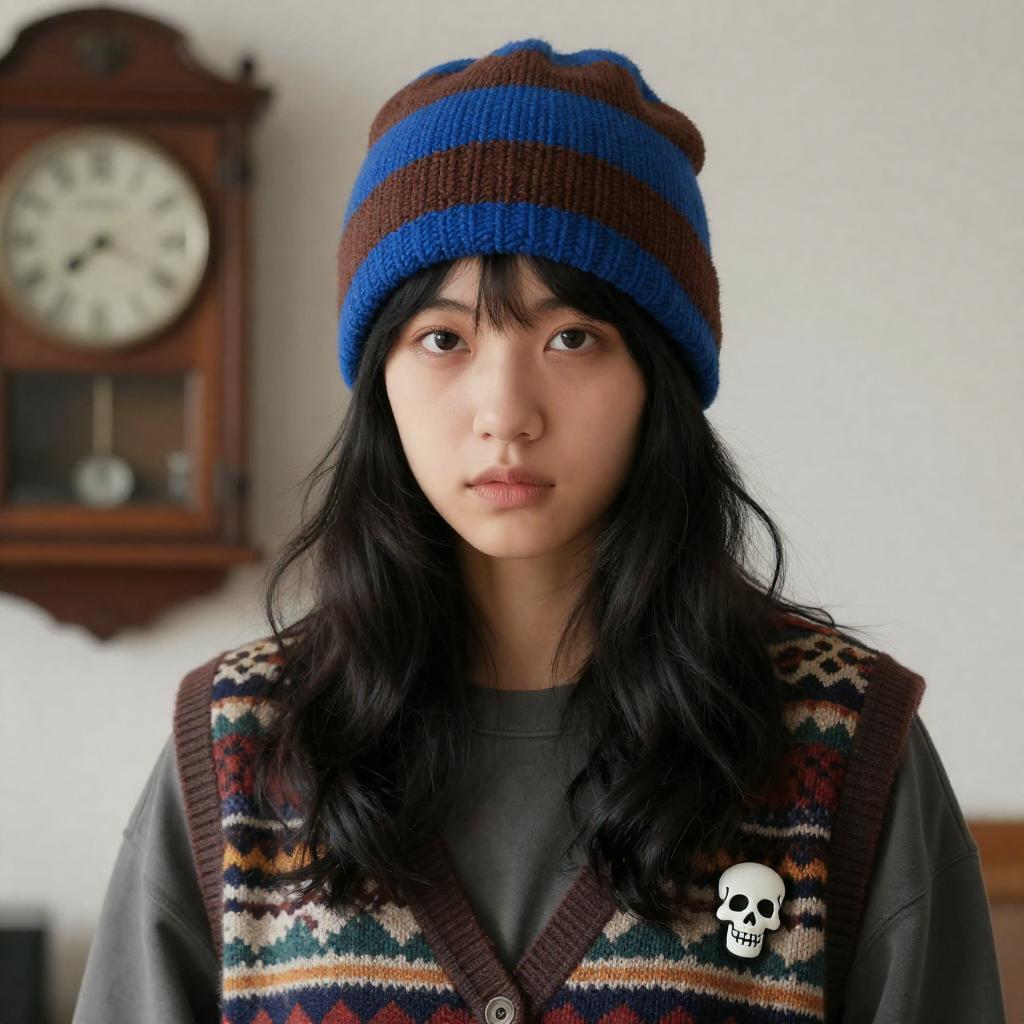 Young woman with long black wavy hair, wearing a knitted beanie with blue and brown stripes, and a patterned, multicolored vest with a skull pin. She has a neutral expression. Background features a wooden clock and a blurred, light-colored wall.