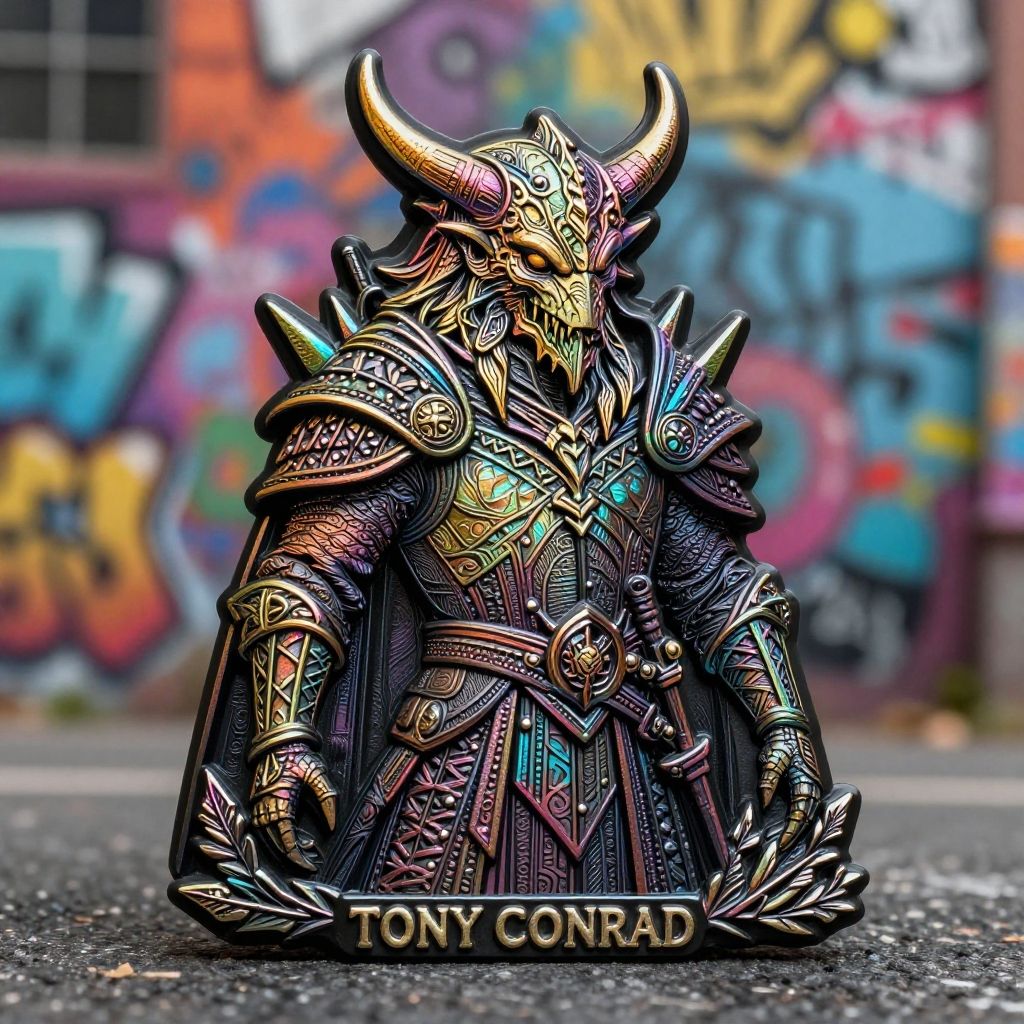 A detailed, digital photograph of a highly ornate, metallic figurine of a horned, armored character named "Tony Conrod." The figure features intricate, glowing patterns on its armor, including spikes and decorative elements. The helmet has prominent horns and a mask-like face. The background showcases vibrant, colorful graffiti art on a blurred urban wall. The figurine stands on a textured, gray pavement. The name "TONY CONRAD" is prominently displayed at the base in bold, metallic lettering. The image has a vibrant, almost iridescent quality to the armor, contrasting with the colorful graffiti.