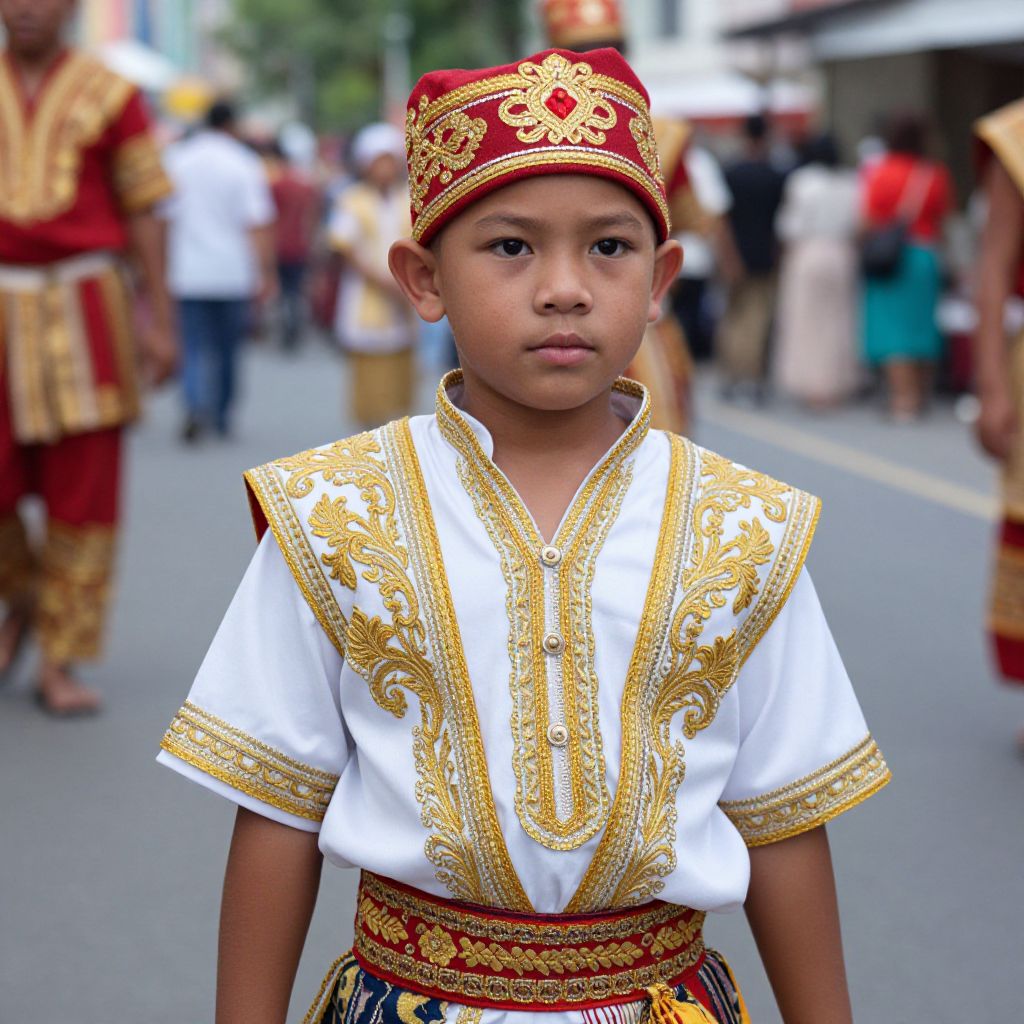 Photograph of a young Asian boy standing on a street during a cultural festival. He wears an ornate white shirt with gold embroidery and intricate patterns, paired with a red and gold sash. His red and gold headpiece matches the sash, featuring detailed floral designs. The boy has a serious expression, with short black hair. In the blurred background, other festival attendees in colorful traditional clothing walk along the street, with buildings and trees visible. The street is lined with people, creating a lively and festive atmosphere.