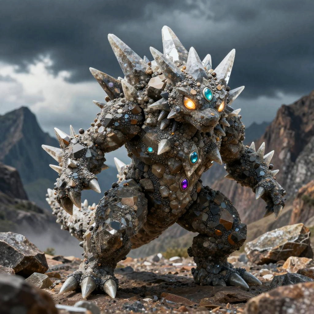 Rock type Fakemon with rugged, crystalline body, sharp mineral spikes jutting out, glowing gemstone eyes, set against a rocky mountain landscape under a stormy sky, detailed textures showcasing minerals and rough stone, dynamic battle stance.