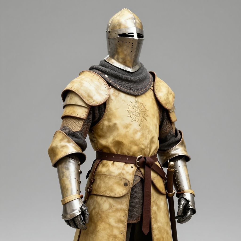 Photograph of medieval knight in shiny, green-scaled armor with silver helmet, standing against gray background, showcasing detailed armor textures.