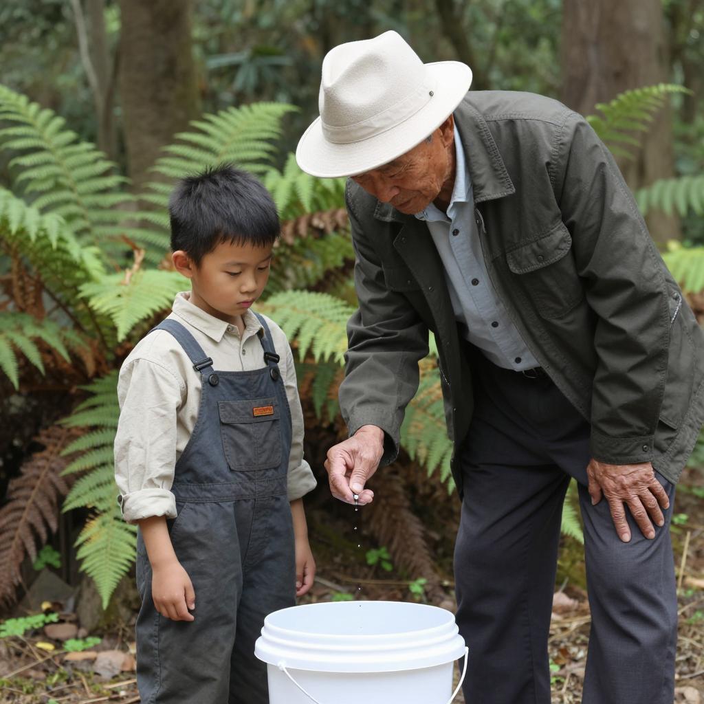 Photograph of an older man and a young boy in a forest. The man wears a white hat, dark jacket, and light shirt. The boy wears a beige shirt and dark overalls. Both focus on a white bucket on the ground. The man holds an object in his right hand, showing it to the boy. Ferns and trees fill the background. The man leans slightly forward, and the boy looks up at him. The man has a gentle expression, and the boy's expression is neutral. The man is on the right, and the boy is on the left. Two people.