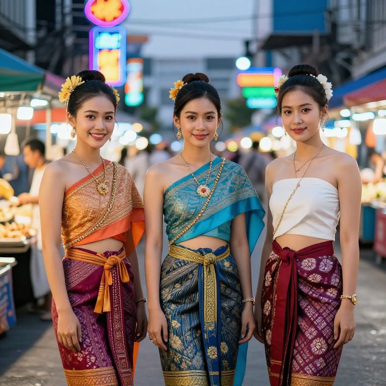 Photograph of three Asian women in traditional Thai attire, standing on a busy evening street market, wearing colorful sarongs, gold jewelry, and floral hair