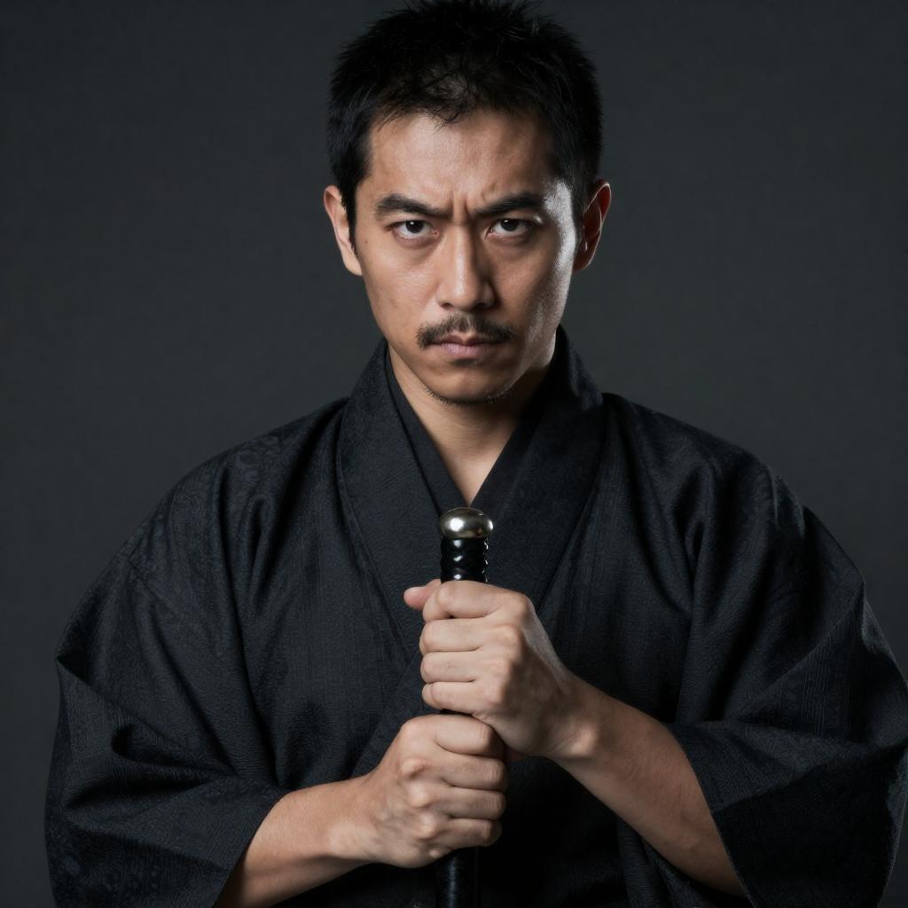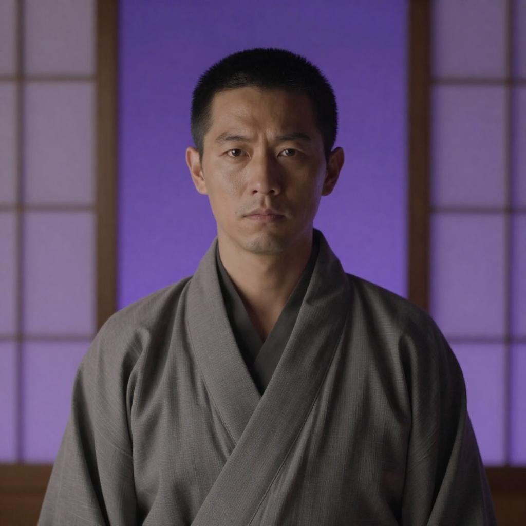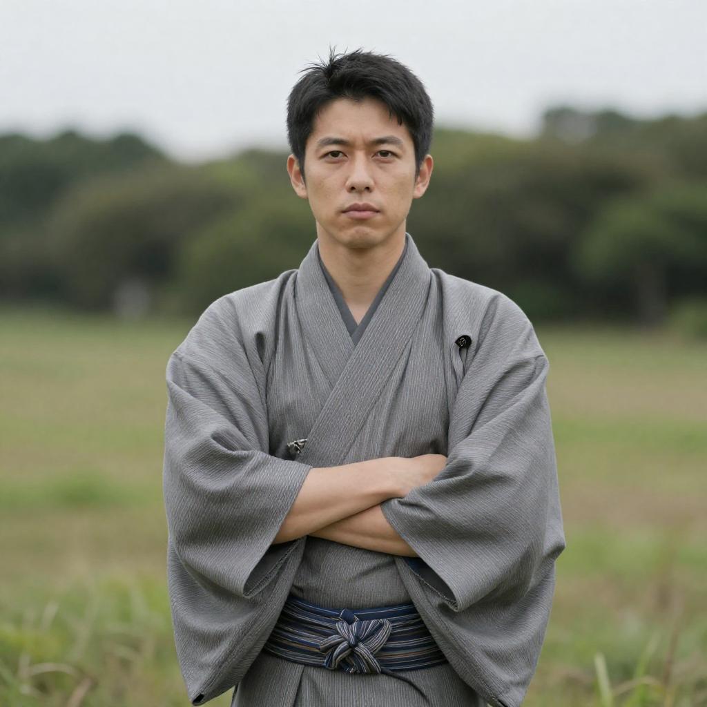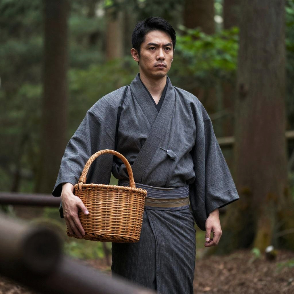 Asian man with receding black hair, wearing blue kimono, holding wooden stick, serious expression. Background: large woven baskets, another person partially visible on left, cloudy sky. Outdoor setting, daytime.