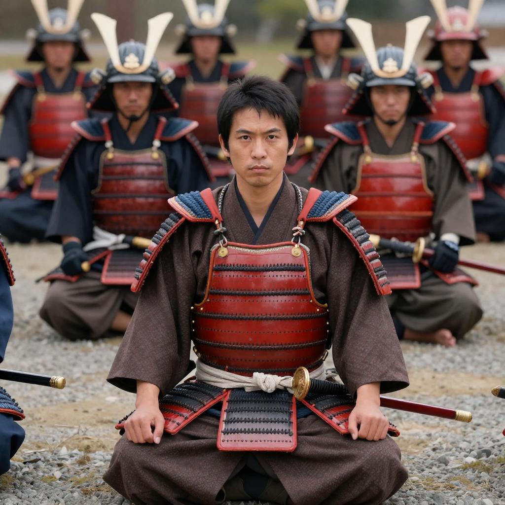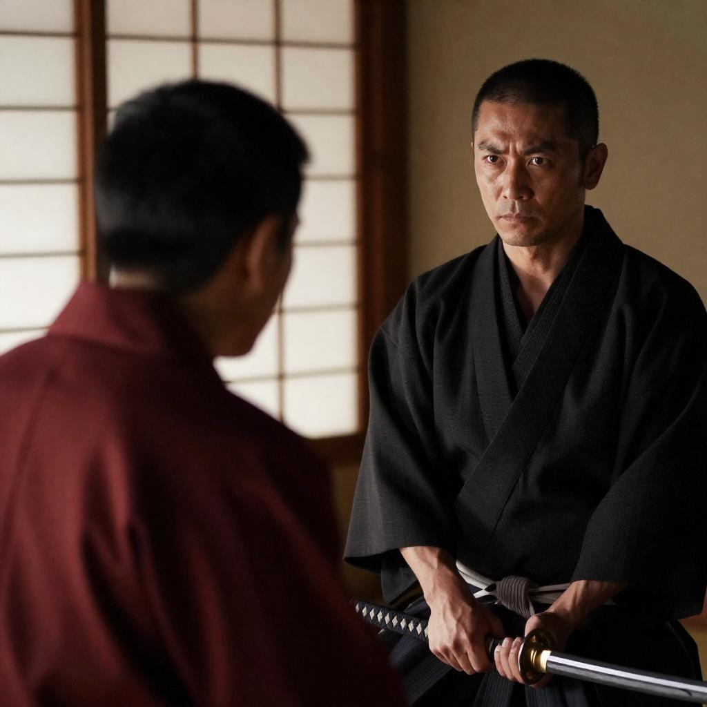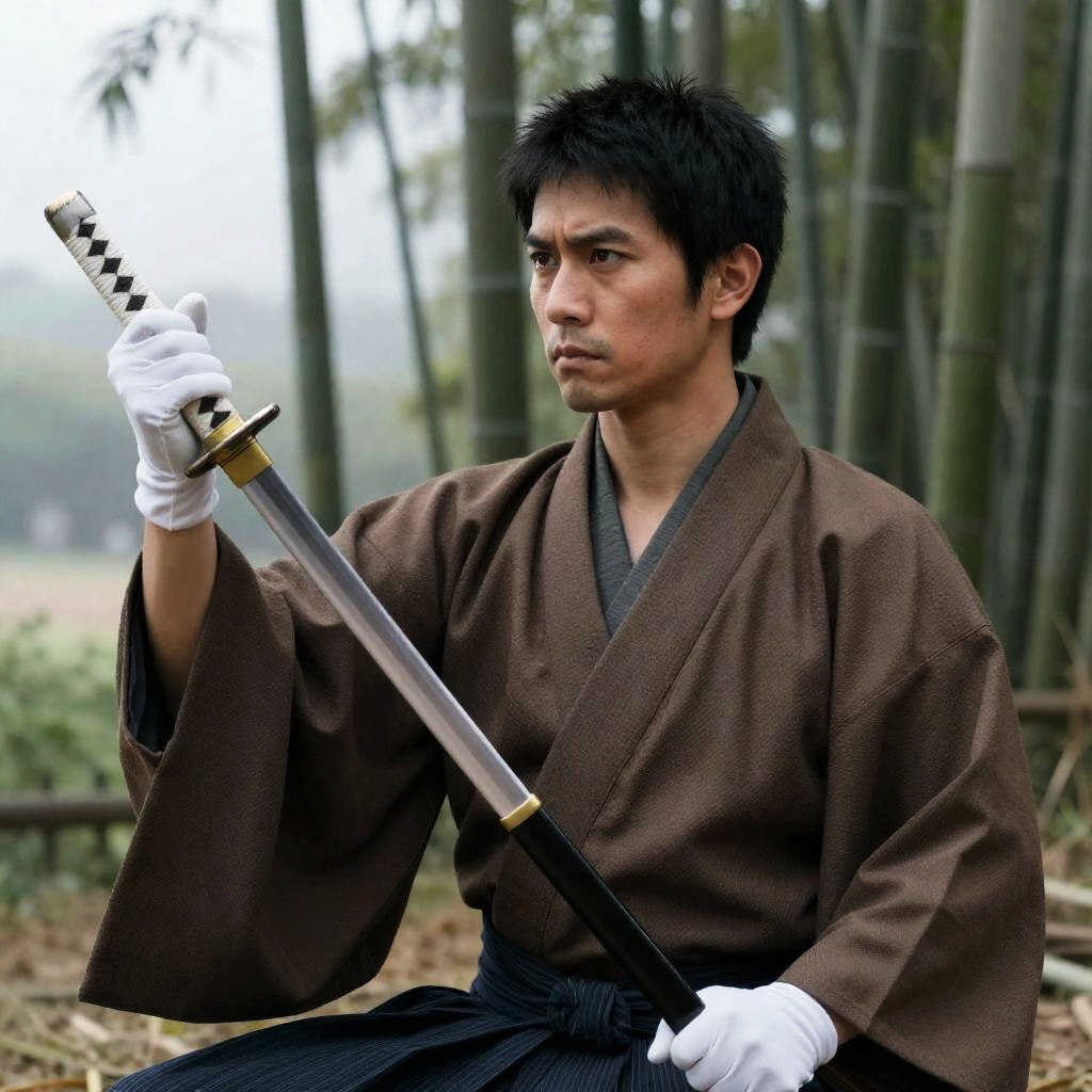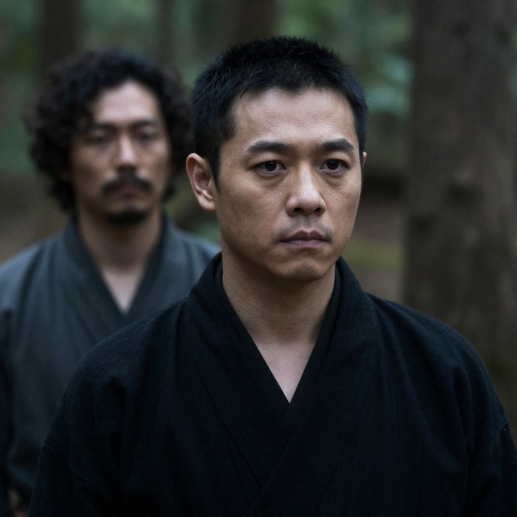 Asian man with receding black hair, wearing blue kimono, holding wooden stick, serious expression. Background: large woven baskets, another person partially visible on left, cloudy sky. Outdoor setting, daytime.
