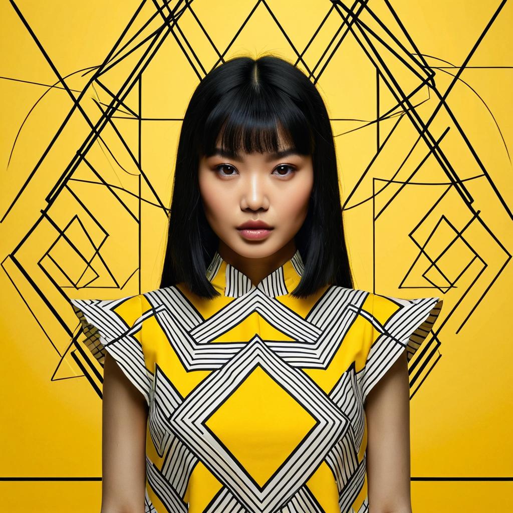 (masterpiece, top quality, best quality, ((standing in centre)), ((1girl, black hair)), ((upper body, symmetrical composition)), ((wear yellow abstract patterns dress bold lines, geometric shapes)), (pure yellow abstract patterns background), ((studio light)) ((studio portrait)), emotional face, face front, extreme detailed