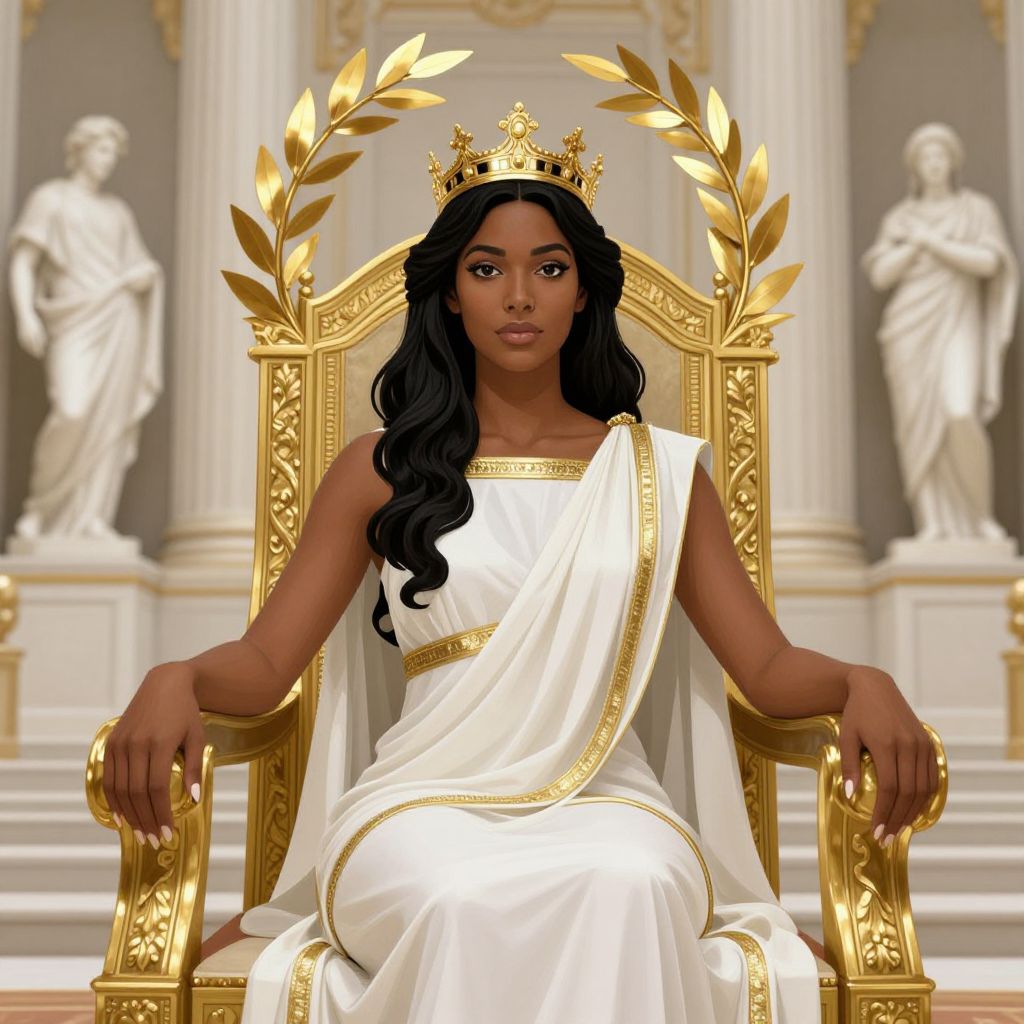 Digital artwork of a dark-skinned woman with long, wavy black hair sitting on a golden throne. She wears a white toga with gold trim, and a golden crown adorned with intricate designs. Her expression is composed and regal. Golden laurel branches frame the throne. The background features white marble statues of classical figures against a grand, classical architectural setting with columns and steps. The image has a realistic yet slightly stylized aesthetic, emphasizing opulence and classical themes.