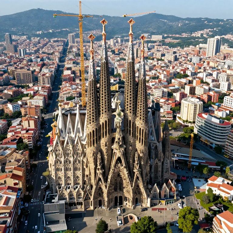Aerial photograph of Barcelona's Sagrada Família, showcasing its intricate Gothic spires amidst a densely packed urban landscape with mountains in the background. Bright