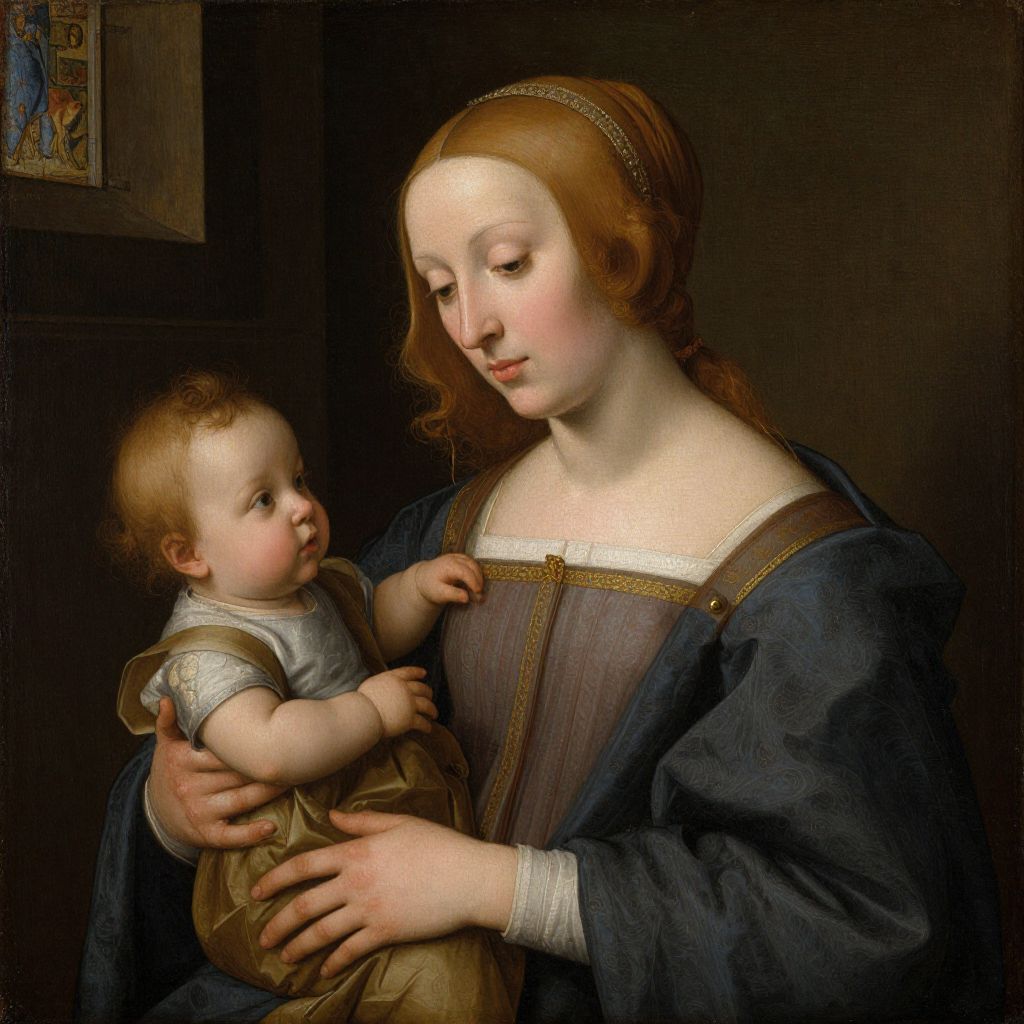 Renaissance portrait of a fair-skinned, red-haired woman in a blue dress and brown vest, hands clasped, soft gaze, dark background