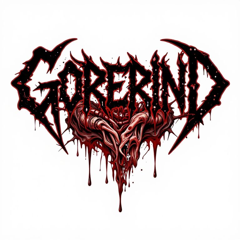 Goregrind logo designed in a twisted, brutal style with decayed flesh textures and dripping gore, combining distorted typography and horror-inspired imagery in stark black and deep crimson tones for a visceral metal band emblem.