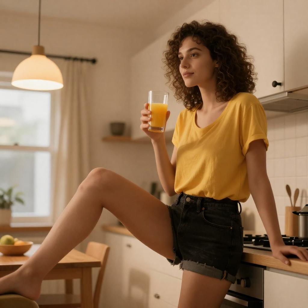 Curly-haired woman with fair skin wearing a yellow t-shirt and black denim shorts stands in a warmly lit kitchen. She holds a glass of orange juice in her right hand, extending her right leg while leaning on the kitchen counter. The scene features a hanging lamp, a window with curtains, and a wooden dining table with a bowl of fruit in the background.
