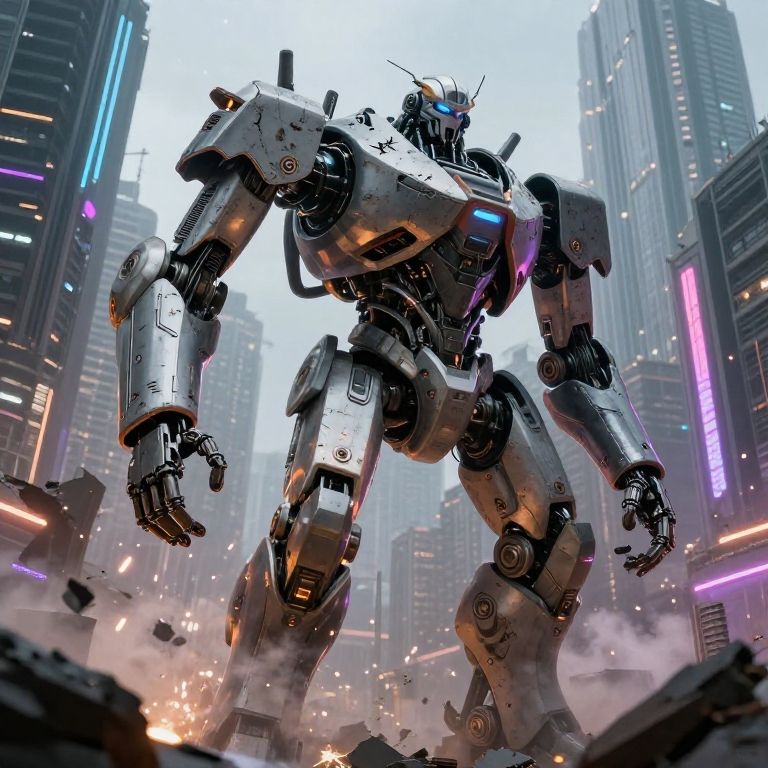 Photorealistic CGI of a towering, silver and grey humanoid robot with glowing blue eyes, wielding a large gun, standing amidst a destroyed urban cityscape
