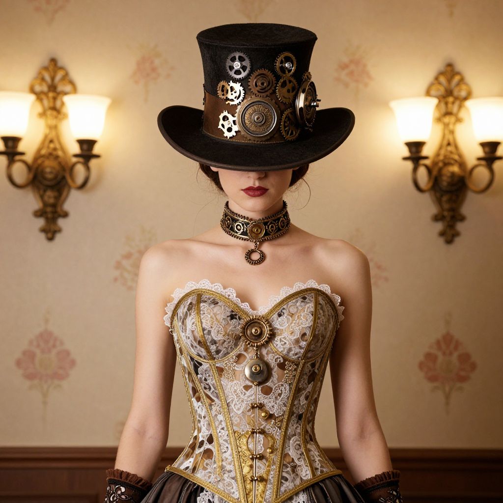 Elegant steampunk ensemble featuring a woman in a Victorian-inspired corset adorned with intricate lace detailing, gold accents, and a matching choker necklace, complemented by a wide-brimmed top hat embellished with mechanical gears and a central circular emblem, set against a warmly lit backdrop with floral wallpaper and ornate wall sconces.