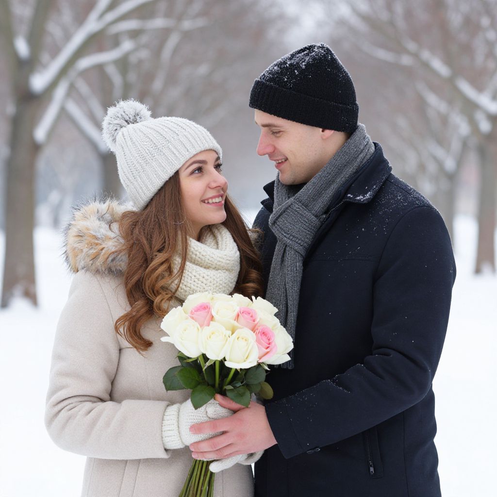 Smiling couple dressed in winter attire stands close together in a snowy park, the woman holding a bouquet of white and pink roses while the man rests his hand gently over hers, both exuding warmth and joy amidst the frosty surroundings.