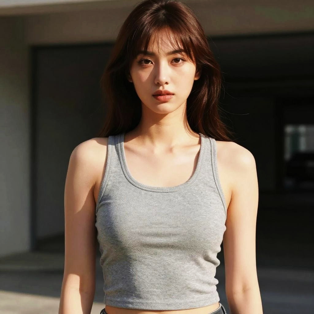 Photograph of an Asian woman with long black hair, wearing a white ribbed tank top that exposes her midriff. She has a fair skin tone, small breasts, and a slender build. Her expression is neutral, with slightly parted lips and dark, almond-shaped eyes looking directly at the camera. The background is a solid, dark gray, providing contrast to her white top. The lighting is even, highlighting her facial features and the texture of her tank top. The image has a studio-like quality, with a focus on simplicity and the subject's natural beauty.