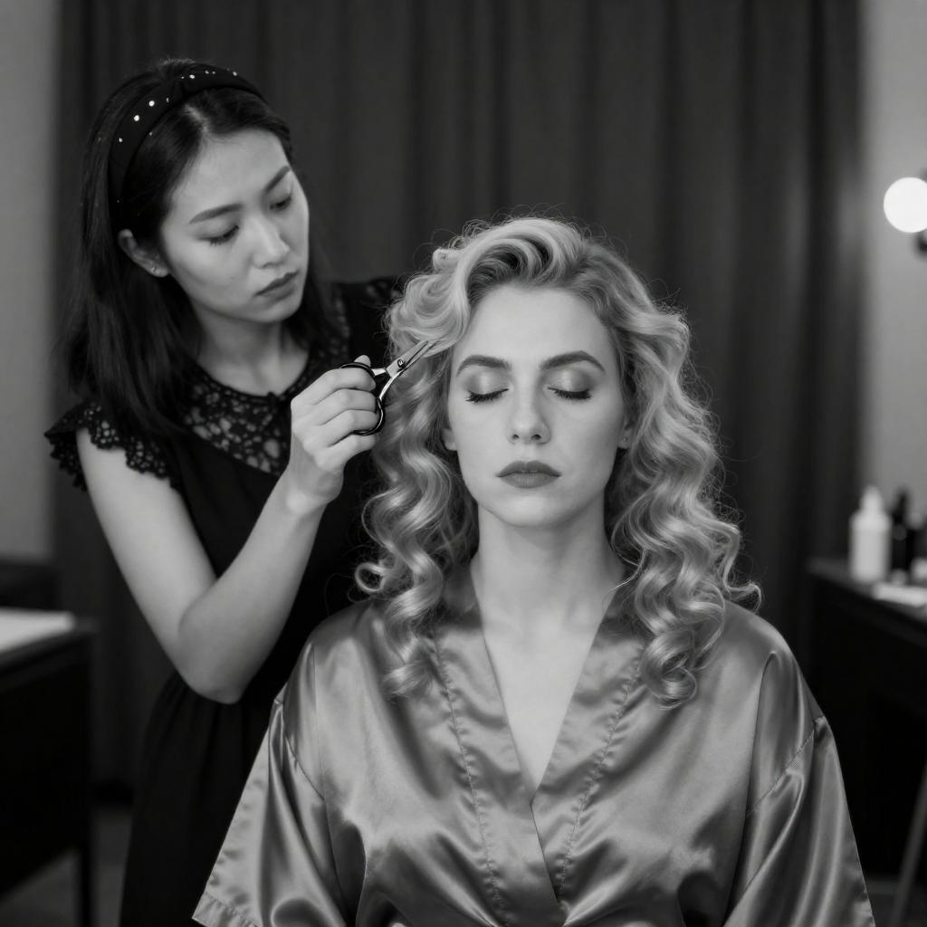 Photograph of three people in a black-and-white setting. Woman with red hair, wearing a pink plaid jacket, shaves a man's face with a razor. Two men, one on left and one on right, observe intently. Man in center reclines, eyes closed. Woman's expression focused, men's expressions serious.