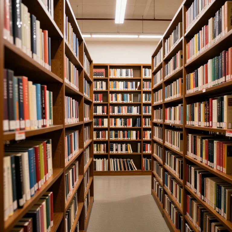 Silent figure walks through a dimly lit library aisle, flanked by towering shelves filled with books that stretch endlessly into the distance, their spines forming a kaleidoscope of colors under the soft glow of overhead lights.