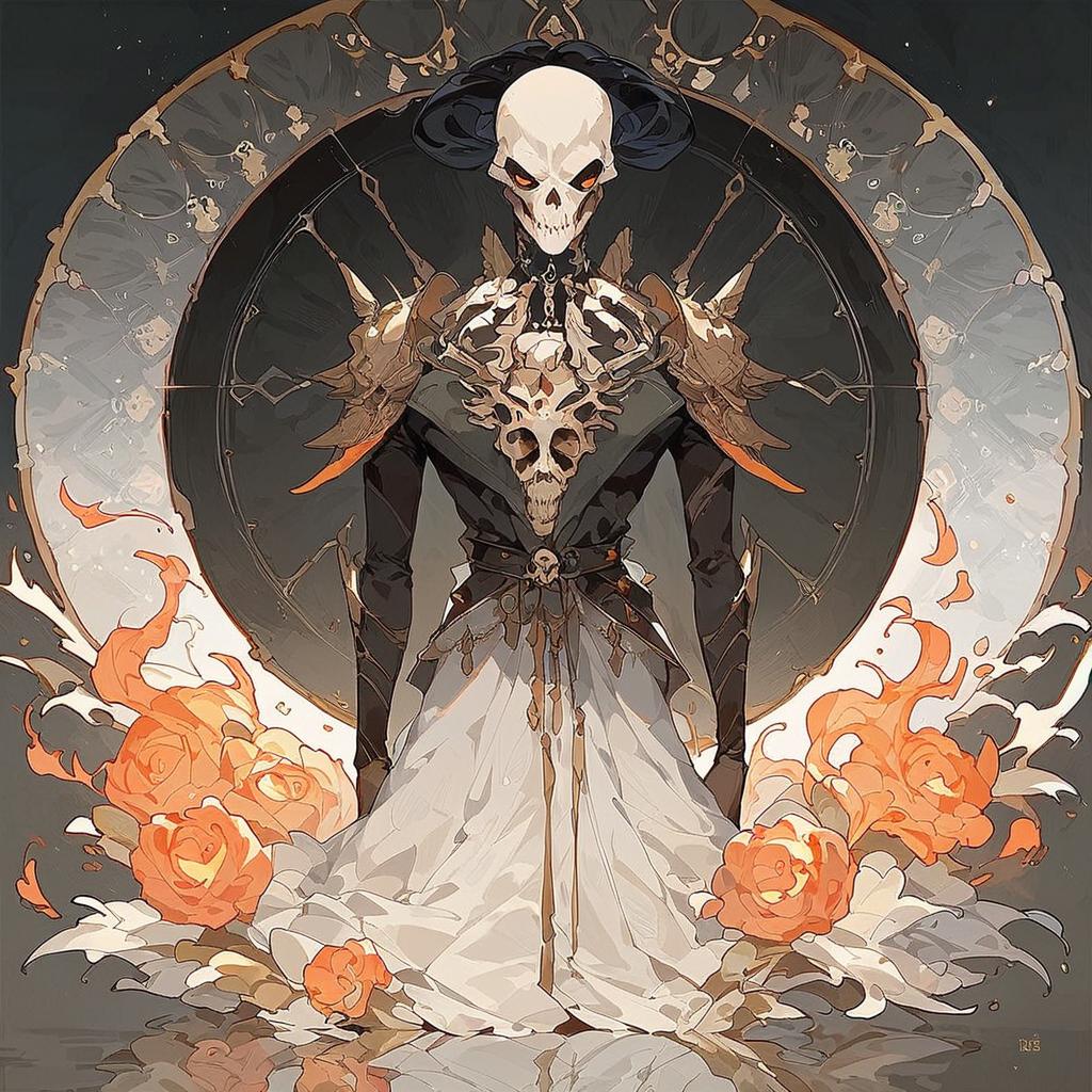 Digital artwork of a skeletal figure with skulls and intricate bone-like armor standing in front of a dark, matte circular background. The figure glows with fire-like orange illumination, surrounded by stylized orange flames and floral elements. The image features a reflection on the ground and detailed subsurface scattering effects, emphasizing the eerie and minimalistic yet highly detailed composition.