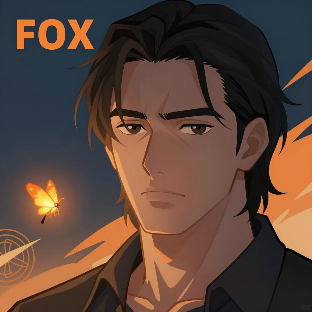 Close-up illustration of a serious-looking man with medium-length black hair, dark eyebrows, and light skin. He wears a dark shirt, with a blue and orange abstract background. A glowing firefly and intricate design are on his left. The word "FOX" is in the top left. His face is slightly shadowed on the right.
